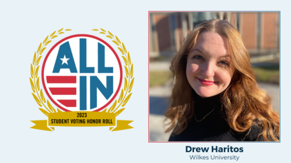 Wilkes University and the ALL IN Campus Democracy Challenge announced that Drew Haritos has been recognized as part of the 2023 ALL IN Student Voting Honor Roll. Haritos, of Chambersburg, Pennsylvania, is a pre-law student with a double major in English and psychology. She is also pursuing a minor in women and gender studies.
