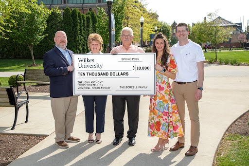 The Borzell family presented Wilkes University with a check for $10,000 and awarded an additional $13,600 in scholarships to eight Wyoming Area High School graduates.
