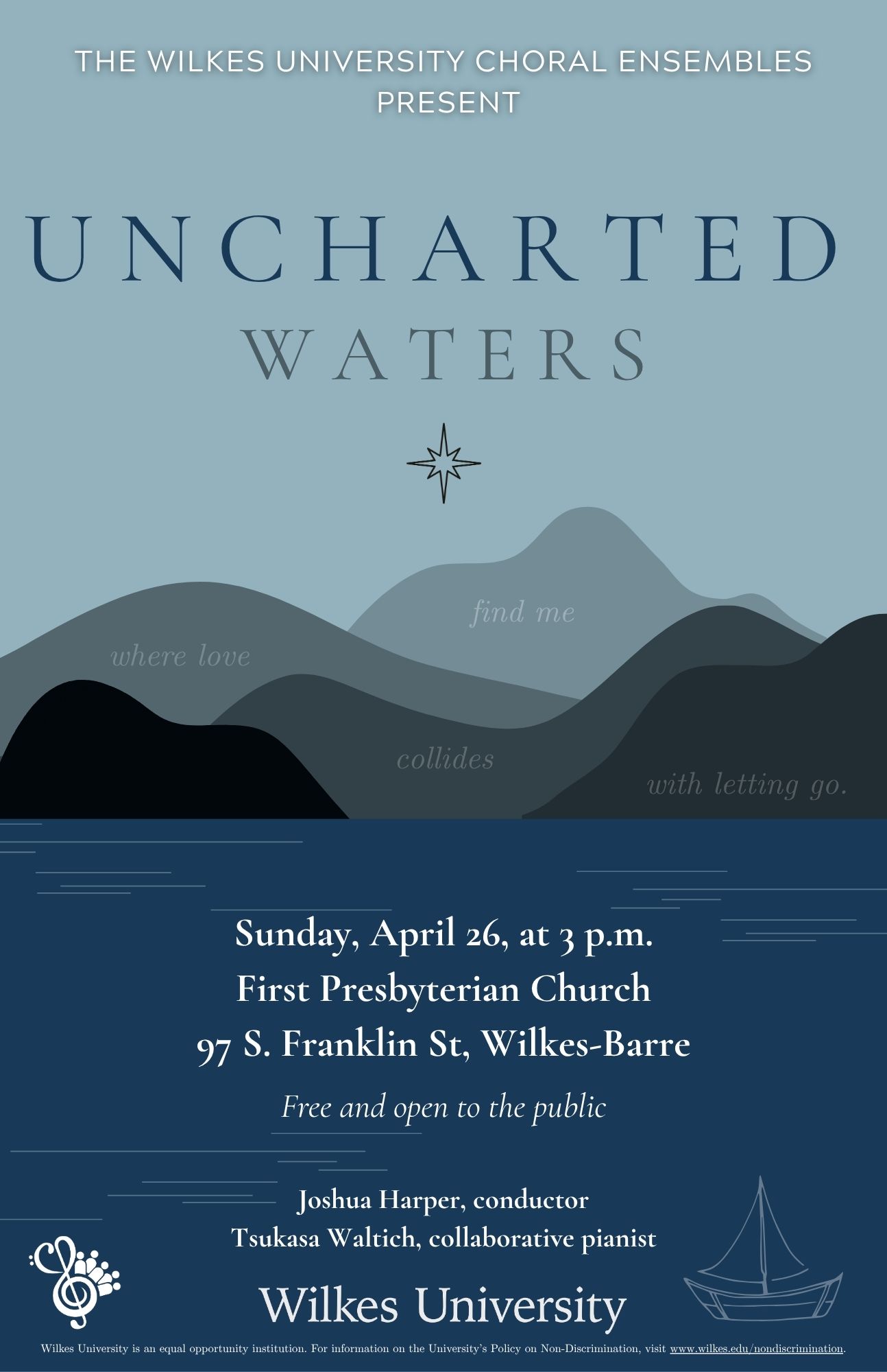 The University Chorus and Chamber Singers will present their concert “Uncharted Waters” on April 26th, 3 p.m. at First Presbyterian Church in Wilkes-Barre. Featuring almost entirely living composers such as Jennifer Lucy Cook, Eric Whitacre, B.E. Boykin, Ola Gjeilo, and more, as well as arrangements by famous artists such as The Highwomen and Ruthie Foster. The Chamber singers will also present Paul Hindemith’s “Six Chansons” on texts by Rilke. There’s something for everyone! Free and open to the public.