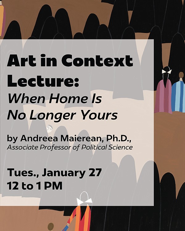 Join us on Tuesday, January 27 at noon for Dr. Andreea Maierean’s lecture, When Home is No Longer Yours. This lecture shares the title with her essay published in the exhibition catalog. Dr. Maierean shares her author’s grandmother’s experience as a World War II refugee in Romania with a broader…